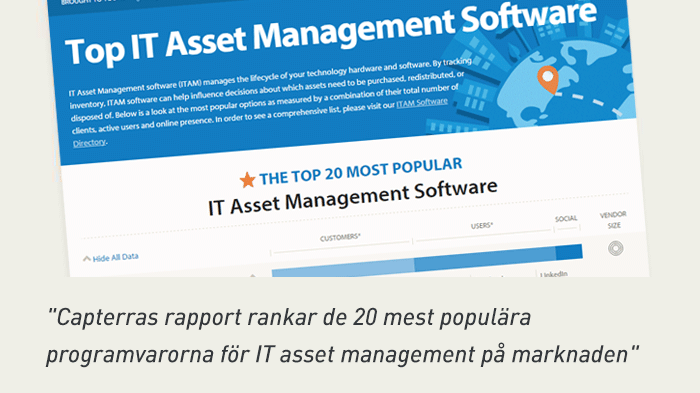 "Capterras rapport rankar de 20 mest populära programvarorna för IT asset management på marknaden", säger Rachel Wille från Capterra. "För att bestämma populariteten analyser vårt team totalt antal användare, totalt antal kunder och social närvaro i en viktad formel. ManageEngine hade den näst största användarbasen med mer än 2 miljoner användare som gjorde att de rankades som nummer två."