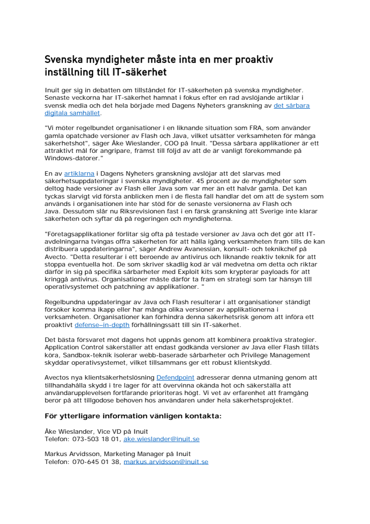 "Vi möter regelbundet organisationer i en liknande situation som FRA, som använder gamla opatchade versioner av Flash och Java, vilket utsätter verksamheten för många säkerhetshot", säger Åke Wieslander, COO på Inuit. "Dessa sårbara applikationer är ett attraktivt mål för angripare, främst till följd av att de är vanligt förekommande på Windows-datorer."
